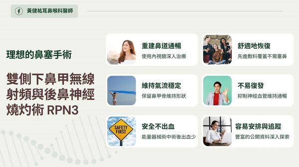 在黃健祐耳鼻喉醫師,我們提供各種專業服務, 本團隊自2023年正式發表創新鼻過敏相關手術:雙側下鼻甲無線射頻與雙側雷射後鼻神經燒灼手術(Radiofrequency ablation of bilateral inferior turbinate with laser posterior nasal nerve neurolysis, RPN3)手術及改進眾多鼻腔手術環節。內容包含多項創新6大手術技巧突破與4大治療觀念突破 。